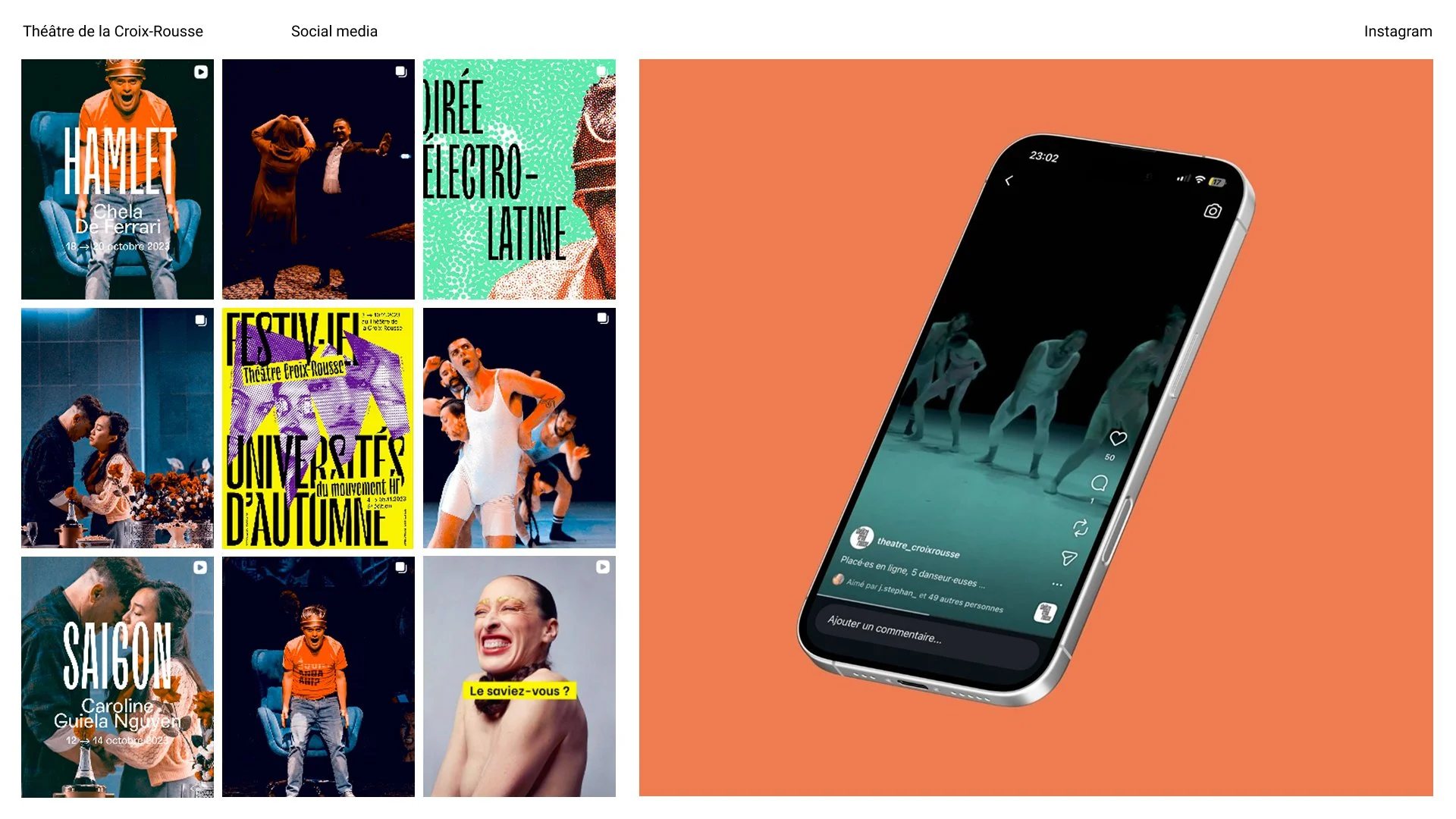 Le Théâtre de la Croix-Rousse se distingue par une identité visuelle forte et atypique, en cohérence avec son positionnement artistique engagé, féministe et avant-gardiste. Son branding repose sur des choix graphiques audacieux et contemporains, reflétant une programmation exigeante et innovante. L’ensemble des supports de communication, qu’ils soient digitaux ou imprimés, s’inscrit dans cette ligne éditoriale, garantissant une cohérence visuelle et un univers reconnaissable qui participent pleinement à l’expérience du public.